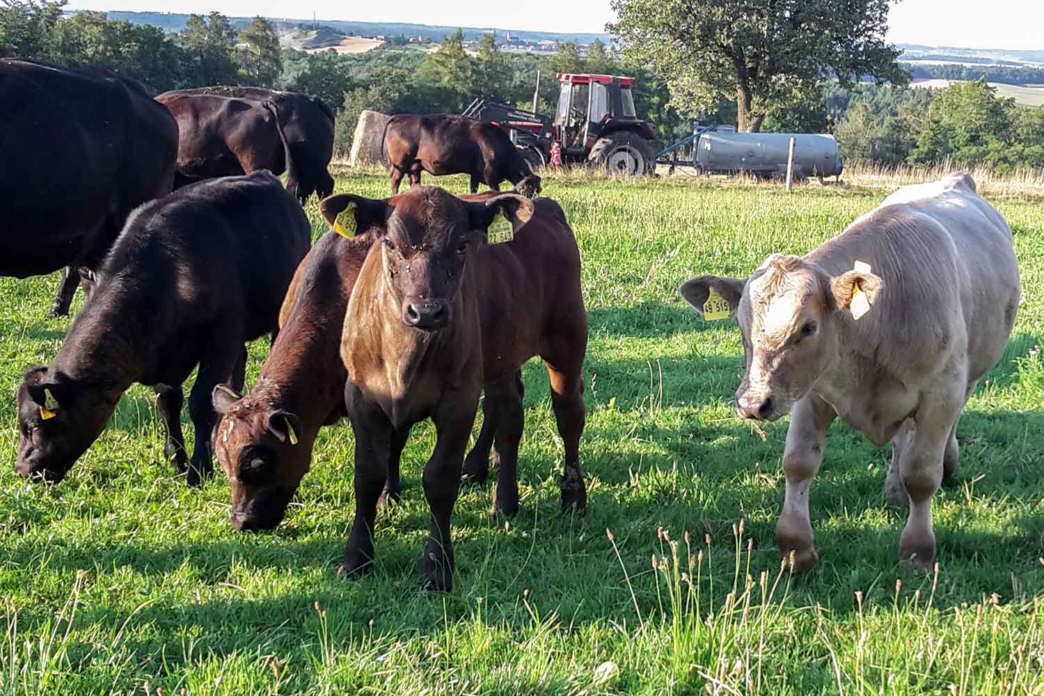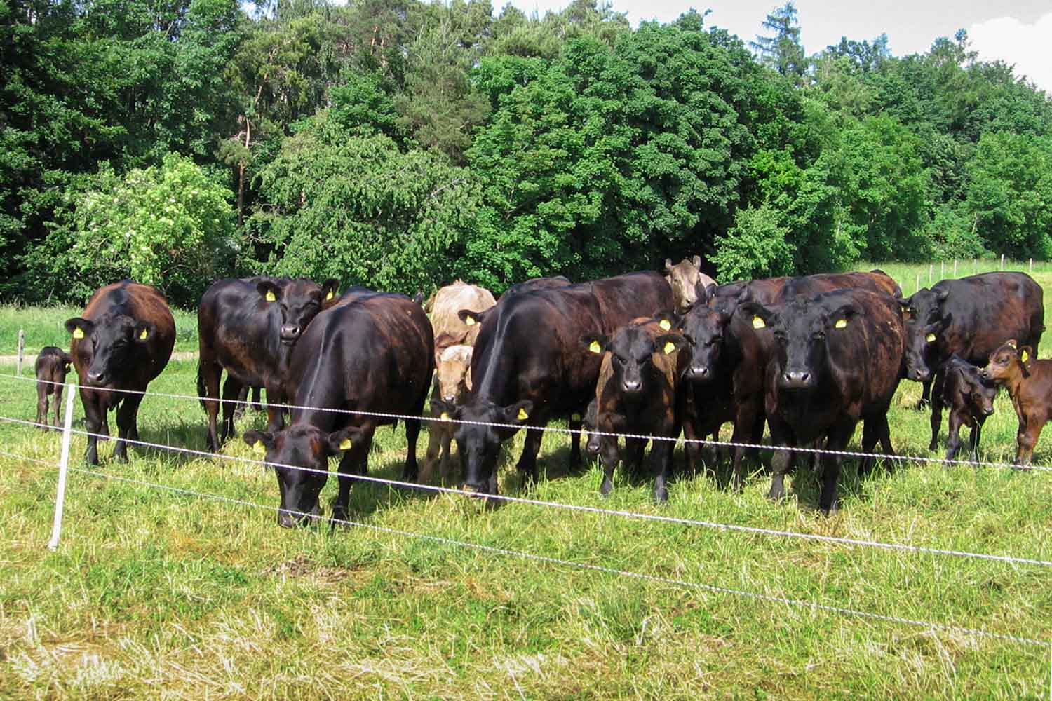 - meist einfarbig schwarze, genetisch hornlose Fleischrinderrasse